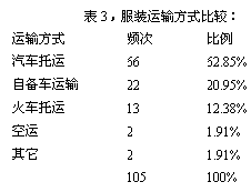 調查顯示,在各服裝批發(fā)市場,采購者采取運輸服裝的最主要方式是汽車托運,其次是自備車運輸。這一數(shù)據(jù)表明在各服裝批發(fā)市場的省內客戶占很大的比例,在外省客戶當中,他們會選擇火車和汽車托運的交叉方式,而空運是人們很少采用的方式。采購者運輸服裝的方式選取見表3: