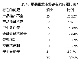 調查顯示,人們普遍認為,當今服裝批發(fā)市場普遍存在的問題是產(chǎn)品檔次不全、產(chǎn)品質量不高、衛(wèi)生條件差等。這些問題都是服裝市場急需解決的問題。這也表明,采購者的要求在不斷提高,他們希望在一個產(chǎn)品檔次全、產(chǎn)品質量高、金融設施健全、環(huán)境舒適的服裝批發(fā)市場采購服裝。服裝批發(fā)市場存在的主要問題見表4:
