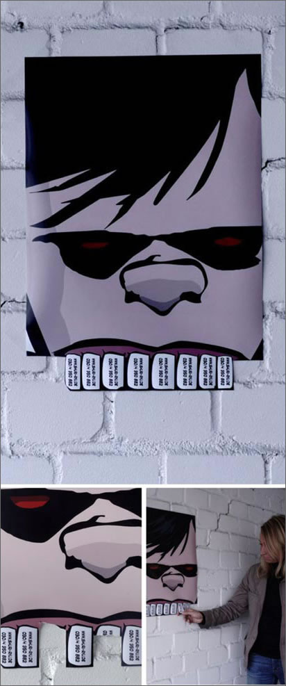 來自街頭:一家防身術(shù)學(xué)校的海報(bào),把惡漢的牙齒拔下一顆來,既拿到了學(xué)校的地址和電話,也舒口心頭惡氣。一石二鳥。