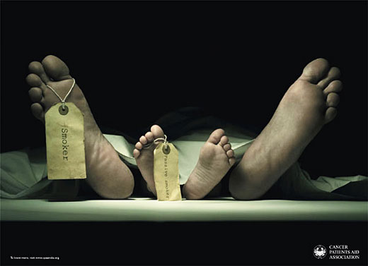 在太平間的兩具尸體上,分別掛著吸煙者與被動(dòng)吸煙者的牌子,畫(huà)面中強(qiáng)光照在小腳上,二手煙受害者更為突出。如果你也是一位吸煙者,請(qǐng)多為自己的家人和身邊的朋友想想吧!