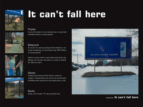 海飛絲,讓頭皮屑無法扎根。白色的雪花正切合了頭皮屑的樣子。整個創(chuàng)意過程真可謂是完全要爭取天時、地利,最后才能獲得人和的傳播效果了。