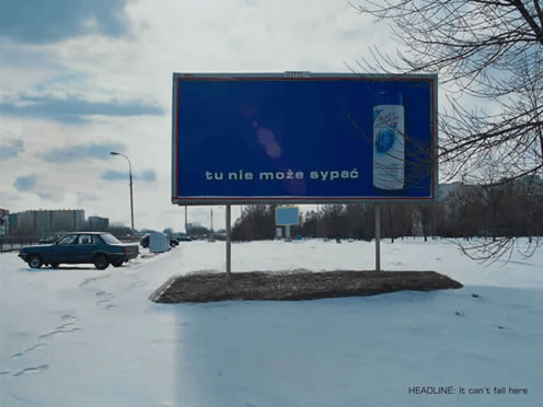 這組戶外執(zhí)行之復雜堪稱一絕了。先圈出牌子下面一塊方形的地來,埋上發(fā)熱裝置,將地面整回原樣。平時看不出什么不同,等到下雪的時候你就會發(fā)現(xiàn),這有這一塊是不粘雪的。恰合了牌子上的文案:它們無法落在這里。