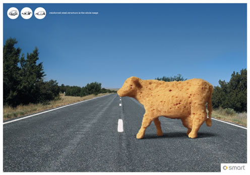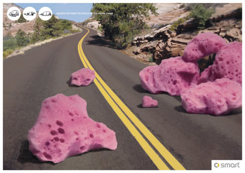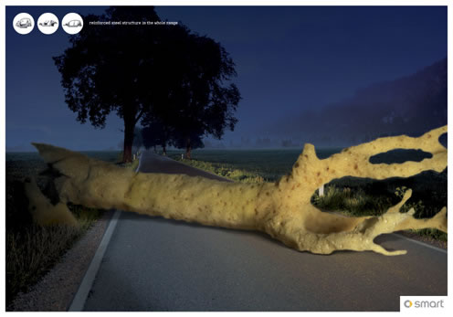 創(chuàng)意亂講:不必再害怕高速路上的崩石、大樹和過路的牛在,因為有了純正增強型鋼架,這些為先在smart看來都像海綿一樣柔軟。