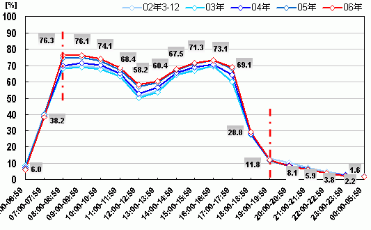 分析2002年至2006年全國三十個(gè)主要城市內(nèi)城鎮(zhèn)居民總體(以下均簡稱居民總體)的日常時(shí)間花費(fèi)可見,在8:00-19:59期間的12個(gè)小時(shí)內(nèi),居民總體在自己家/親朋家之外(以下均稱為家之外)的區(qū)域停留的時(shí)間越來越長,如圖二所示。