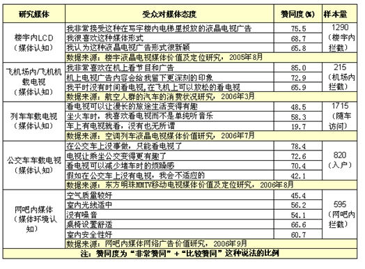 多年來,新生代市場監(jiān)測機(jī)構(gòu)通過對各種“戶外視頻媒體”的專項(xiàng)研究經(jīng)驗(yàn)發(fā)現(xiàn),無論是“樓宇類戶外視頻媒體”還是“交通類戶外視頻媒體”,一方面,由于其所處媒體環(huán)境都是媒介相對稀缺的環(huán)境,從而從源頭上減少了其它媒介瓜分目標(biāo)受眾的機(jī)會(huì),為媒體觸達(dá)更多的目標(biāo)受眾創(chuàng)造了有利的條件;另一方面,相對于樓宇內(nèi)和交通工具上存在的其它靜態(tài)媒體(海報(bào)、條幅、DM等),擁有動(dòng)態(tài)畫面、立體聲音的視頻媒體,更容易吸引目標(biāo)受眾主動(dòng)關(guān)注,受眾對媒體接受度、認(rèn)知度高(如表一所示),從而確保媒體的有效到達(dá)。