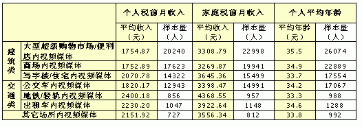 表三:各細(xì)分戶外視頻媒體周到達(dá)人群收入、年齡狀況
