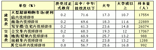 表四: 各細(xì)分戶外視頻媒體周到達(dá)人群受教育程度
