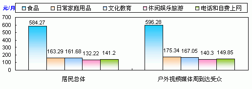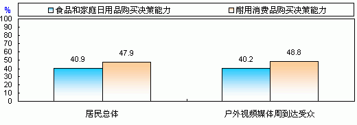 從目標(biāo)受眾擁有日常支出決策權(quán)的比例來看,“戶外視頻媒體”的受眾中無論是擁有家庭日常消費(fèi)決策權(quán),還是購買耐用消費(fèi)品決策權(quán)的比例均明顯高于居民總體,可見,“戶外視頻媒體”的受眾是一個(gè)消費(fèi)決策力較強(qiáng)的群體。