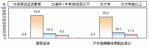而從受眾的受教育程度來看,“戶外視頻媒體”的受眾中,受過大專及以上高等教育的人群比例明顯高于居民總體。