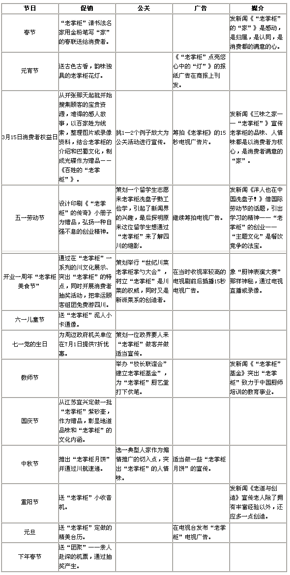 在全面成長期,以節(jié)假日為創(chuàng)意線索,結(jié)合“三味”,層層推出“老掌柜”的促銷、公關(guān)和廣告創(chuàng)意活動。