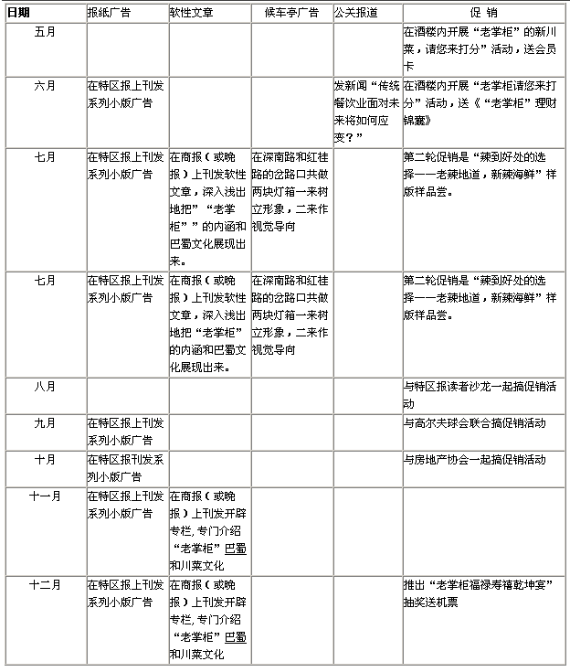 H、后三個(gè)月的推廣側(cè)重于公關(guān),這個(gè)階段密切關(guān)注社會各界名流來深的動向,一有機(jī)會,就盛情邀請其來“老掌柜”作客,制造一些這位名人在“老掌柜”所發(fā)生的事件,并借新聞炒作。