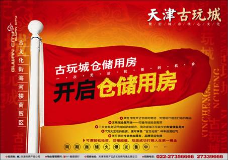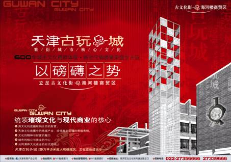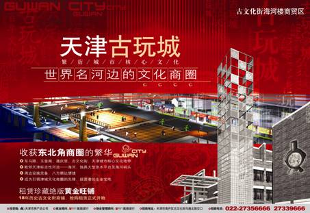 經(jīng)過多次征集與討論,古文化街商貿(mào)區(qū)的新推項目“天津古玩城”終于鎖定案名,蓄勢待發(fā),準備接受消費者驗證市場的考驗。而前期的廣告宣傳是否與項目貼切,是否能為項目的后期銷售提升一個高度,則取決于該項目的前期廣告宣傳策略。