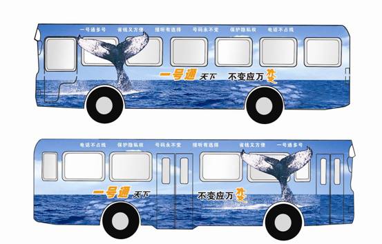 (2)公交車廣告。選擇具有影響力的主要交通要道的公交車輛,利用廣泛的人車流量,推廣“一號(hào)通”業(yè)務(wù);媒體:4路;載具:整體車身廣告。