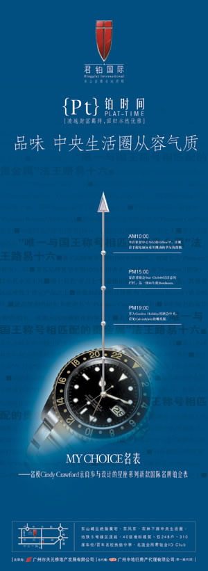 圍繞著君鉑國際的正式公開發(fā)售,我們也拉開了全方位的形象造勢活動。其中,一系列格調(diào)渲染式的平面廣告,是營造樓盤高端個性形象的重中之重。
