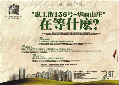 在這樣一個信息爆炸的年代,房地產(chǎn)推廣所倚重的報紙廣告已經(jīng)很難達到過去那種影響力了,如果宣傳缺乏與眾不同的切入點,就很容易落入俗套。造成投入大,效果不理想。像華麗山莊這樣的項目找到一個能引起轟動效應(yīng)的強有力的宣傳點又很難,這也是宣傳遲遲未啟動的原因。