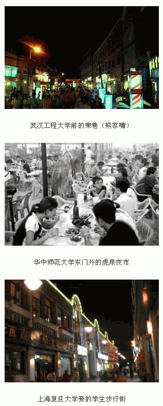 武漢就更盛了。據(jù)統(tǒng)計(jì),武漢有各類大專院校50余所,高校數(shù)量居全國(guó)第三位。大凡學(xué)生數(shù)量超過(guò)3000人的,周邊都有一條由學(xué)生來(lái)“養(yǎng)活”的街。如華中師范大學(xué),主要集中在廣埠屯和虎泉一帶,其中廣埠屯最初為服務(wù)周邊幾大高校的IT配件集中地,5年的發(fā)展已經(jīng)成為武漢最具名氣的電腦IT產(chǎn)品集散地;虎泉一帶已經(jīng)成為華師及周邊高校學(xué)生購(gòu)物、休閑消費(fèi)的主要場(chǎng)所,主要分布服飾、餐飲、娛樂(lè)、書店等,虎泉夜市已經(jīng)是武昌小有名氣的美食街。
