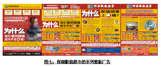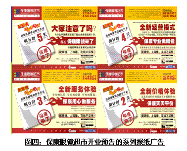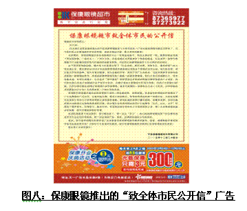 在?甸_(kāi)業(yè)之后推出的一系列廣告宣傳中,?稻o緊圍繞“為什么我們要把眼鏡超市開(kāi)在4樓?”、“為什么配眼鏡要上4樓?”等內(nèi)容做足文章,把自己存在事實(shí)上的劣勢(shì)比較誠(chéng)懇地向消費(fèi)者說(shuō)明企業(yè)的本身意圖,并甚至用“保康眼鏡超市致全體市民公開(kāi)信”的形式,一方面對(duì)消費(fèi)者購(gòu)物帶來(lái)的不方便表示歉意,同時(shí)也幫消費(fèi)者算清?笛坨R超市怎樣能夠做到“相同品牌、相同型號(hào)、相同服務(wù)”的前提下,價(jià)格能夠更實(shí)惠、更優(yōu)惠。同時(shí)巧妙地把近期寧波眼鏡商店為什么不約而同開(kāi)始大規(guī)模進(jìn)行廣告投入和促銷(xiāo)活動(dòng)的真正原因進(jìn)行了說(shuō)明,使得消費(fèi)者知道為什么傳統(tǒng)眼鏡店對(duì)保康眼鏡超市的到來(lái)會(huì)這么的緊張。并且把消費(fèi)者很容易理解的“(因營(yíng)業(yè)地點(diǎn)從1樓到四樓)租金成本的大幅降低、(因面積是普通眼鏡店的數(shù)十倍)營(yíng)業(yè)規(guī)模的數(shù)倍擴(kuò)大、(因銷(xiāo)售量的增大)進(jìn)貨價(jià)格的明顯下降”等因素帶來(lái)的直接利益?zhèn)鬟f給消費(fèi)者,使消費(fèi)者中較為理性的一部分人群很快能夠說(shuō)服自己“上四樓雖然有點(diǎn)不方便,但直接利益很明顯”。從而通過(guò)“講道理”贏得嘗試性消費(fèi)人群的青睞。