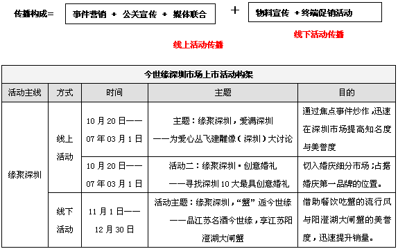 2、婚慶市場作為一個有利市場不能丟;但同時也不能局限在里面;顒右浴熬壘凵钲凇睘橹骶在婚慶、商務(wù)二大重點(diǎn)市場集中資源進(jìn)行突破,將線上傳播與線下傳播有機(jī)結(jié)合,空中與地面相互配合,提高傳播的有效率。