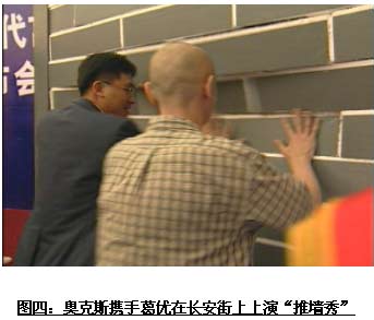 新聞發(fā)布會看似常規(guī)的開始了,主持人講話,奧克斯通訊總經(jīng)理陳凱峰致詞,無外乎再次表明自己的實力以及做大做強(qiáng)手機(jī)產(chǎn)業(yè)的決心與信心。但奧克斯的新聞發(fā)布會上從來不缺少真正的新聞,葛優(yōu)欣然接受奧克斯頒發(fā)的形象代言人聘書并以及自己特有的幽默方式至此,與此同時以葛優(yōu)為形象代言人的廣告片也在發(fā)布會現(xiàn)場正式播放,主持人不失時機(jī)地宣稱,只要國內(nèi)手機(jī)“牌照”正式放開,此條廣告就可全面進(jìn)行投放了。這又將媒體記者從“追星”的熱鬧中拉回到“牌照”的困惑中,接下來一個看似有趣的“行為秀”卻一下吸引了眾多攝影媒體的鏡頭。陳凱峰邀請葛優(yōu)一起推到一面巨大的泡沫墻,并從后面的冰箱中取出手機(jī)簽名后交換。雖然奧克斯沒有對推倒這堵泡沫制成的墻做任何解釋,甚至告知葛優(yōu)也只是烘托氣氛的一個環(huán)節(jié),豈不知第二天很多媒體將此行為稱為推倒阻隔在手機(jī)行業(yè)發(fā)展過程中的“牌照之墻”?磥韸W克斯的良苦用心,以及在北京時的謹(jǐn)小慎微還是被媒體充分解讀了。
