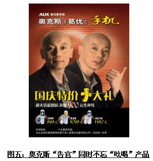 并且為回避有無“牌照”能否做廣告的嫌疑,奧克斯巧妙地用“奧克斯請葛優(yōu)賣手機(jī)”的措辭避免了“奧克斯手機(jī)”單獨(dú)作為廣告出現(xiàn)的監(jiān)管。此時,空中大規(guī)模的新聞報道,地面鋪天蓋地的終端宣傳,加之配合有力的促銷活動,奧克斯在沒有“牌照”的2004年“十一黃金周期間”又實現(xiàn)了銷量翻番的增長。