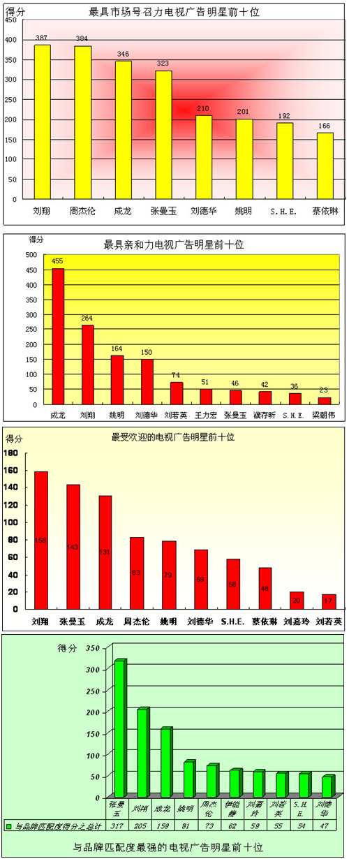 上海市民心目中的中國(guó)電視廣告明星調(diào)查,主要是從受眾、消費(fèi)者的角度來(lái)進(jìn)行測(cè)評(píng),讓上海市民評(píng)選出自己心目中最具親和力電視廣告明星;與代言產(chǎn)品品牌最匹配電視廣告明星;最具市場(chǎng)號(hào)召力電視廣告明星;最受歡迎電視廣告明星等