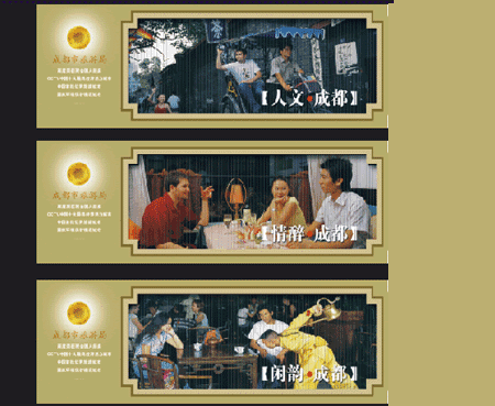 1.最完整全面地含概了各種有代表性的成都元素,實現(xiàn)了完全意義上的優(yōu)化組合,而且通過主畫面構圖凸現(xiàn)了各個不同的宣傳主題。