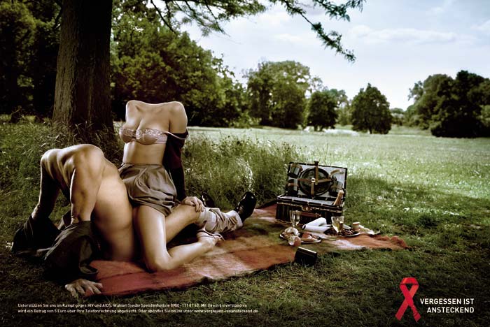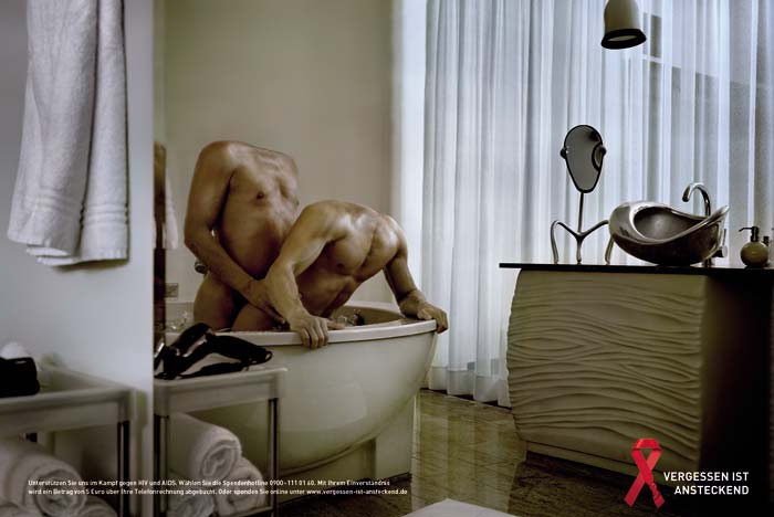德國(guó)DieStutze雜志在2005年11月放出的Vergessen ist ansteckend 為2006年Reminders Day Aidsgala制作的系列艾滋病公益廣告作品,這組廣告由來(lái)自于漢堡的攝影攝像師Anatol Kotte 主創(chuàng),整套作品包括5張出色的攝影作品,1部電視廣告,和2部電臺(tái)作品.Reminders Day活動(dòng)已經(jīng)成為世界艾滋病日不可缺少的一次聚會(huì)了,每年的獎(jiǎng)項(xiàng)都會(huì)頒發(fā)給為抵抗艾滋病做出巨大貢獻(xiàn)的人!