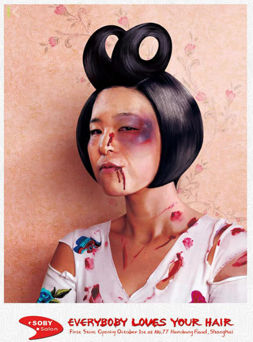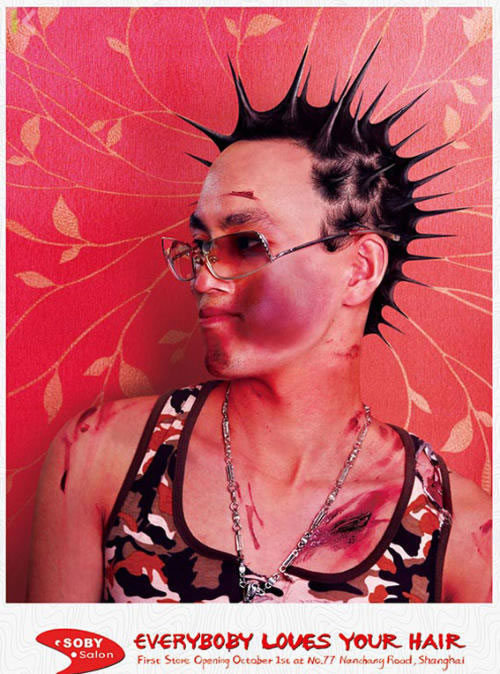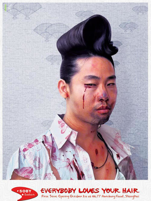 為一家即將開(kāi)張的發(fā)型沙龍做的平面!懊總(gè)人都愛(ài)你的頭發(fā)”,這幫古惑仔、小太妹被毆得體無(wú)完膚,不過(guò)發(fā)型倒是保持得不錯(cuò),嗯,被歐的原因或許就是因?yàn)檫@么欠扁的發(fā)型吧。作品的邏輯真是令認(rèn)啞然。這樣的一家發(fā)型沙龍誰(shuí)敢來(lái)呀?都是給誰(shuí)做頭發(fā)的,哈哈!