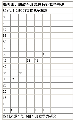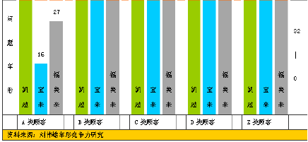 在E類細(xì)分市場,福美來與寶來基礎(chǔ)性特征有效近似率為34%,與70%相差較遠(yuǎn)。關(guān)鍵性特征方面為52%,已經(jīng)比50%高出兩個百分點(diǎn)?傮w性特征方面為43%,未達(dá)到60%。從這些近似率數(shù)據(jù)表明,福美來與寶來在車形風(fēng)格方面對于E類細(xì)分市場而言并未構(gòu)成明顯的競爭關(guān)系。只是對于對于部分經(jīng)濟(jì)因素對其購車決策影響很小,而關(guān)鍵性特征對其購車決策影響較大,并且其關(guān)鍵性特征與E類消費(fèi)群體比較接近的購車群體者而言,它們之間存在微弱的競爭關(guān)系,不過這種消費(fèi)者是極少見的。