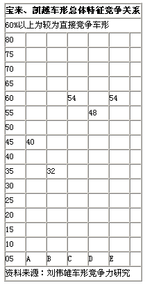 在C類細(xì)分市場,寶來與凱越基礎(chǔ)性特征有效近似率為58%,未達(dá)到70%。關(guān)鍵性特征方面為49%,只與50%相差一個百分點(diǎn)。總體性特征方面為54%,也比較接近60%。從這些近似率數(shù)據(jù)表明,寶來與福美來在車形風(fēng)格方面對于C類細(xì)分市場而言未構(gòu)成較為之間的競爭關(guān)系。