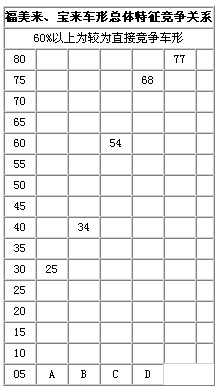 在A類細(xì)分市場,福美來與寶來基礎(chǔ)性特征有效近似率為20%,與70%相差甚遠(yuǎn)。關(guān)鍵性特征方面為34%,也遠(yuǎn)遠(yuǎn)小于50%?傮w性特征方面為27%,也與60%有超過一半之距。從這些近似率數(shù)據(jù)表明,福美來與寶來在車形風(fēng)格方面對于A類細(xì)分市場而言未遠(yuǎn)遠(yuǎn)未構(gòu)成競爭關(guān)系。