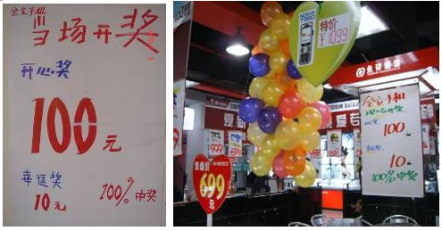 五月五日,當大多數(shù)手機品牌開始放棄促銷的時候,金立手機的業(yè)務員和促銷員開始了新一輪攻勢。舉牌、喊話、送錢活動卷土重來。一串氣球像一串令人垂涎三尺的葡萄,昭示著顧客前來購買。每每銷售一部手機,就能聽到一聲氣球破裂的聲響,每一次中大獎就能引發(fā)一陣開心的叫聲,中獎100元者又是登記填表領(lǐng)錢,又是合影留念,金立手機自編自演的這種“獨角戲”,為沉悶下來的賣場增添了耐人尋味的樂趣,當天 280 臺的銷量也為貴陽辦總銷量的完成加大了成功的砝碼。遺憾的是,業(yè)務員為了100元大獎不流失,把大獎的紙條統(tǒng)一裝入藍色的氣球,致使大獎中獎比例為 1:15 比 ,大大超過了計劃的1:30。損失800 元。