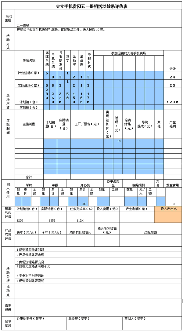 很多公司做節(jié)日促銷,不相信能賺錢也沒有指望活動賺錢;張小虎做促銷,銷量翻三倍,保證利潤翻三倍。去年五一,金立手機貴陽市區(qū)僅僅銷售376臺,今年五一銷售1358臺,去年手機均價不到1100元,今年手機均價1400多元,平均每臺多賣300元,基本上與三大國際品牌的手機均價持平。通過張小虎曾經(jīng)獨立設計的“萬能促銷評估表”詳細計算,投入產(chǎn)出比在1:10之上。(涉及客戶機密,具體手機機型組合,利潤生成等部分數(shù)字刪去)