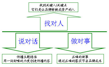 即“找對人”、“說對話”、“做對事”。找對人,是指在傳播中有針對性地向各個階段的關(guān)鍵人傳播,并找到有效的品牌傳播的關(guān)鍵接觸點;說對話,是指傳播主題要精準(zhǔn),用一劍封喉的力度創(chuàng)造傳播內(nèi)容;做對事,是指通過正確的落實節(jié)省品牌成本。