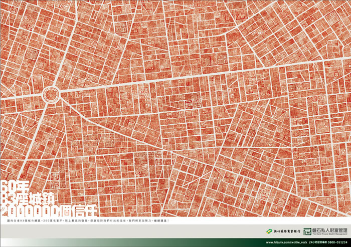臺灣本土消費者與銀行交易時,總會以蓋印章來證明同意這一筆交易。 創(chuàng)意表現(xiàn)以眾多客戶的印章,排列成城市與蓋印成地圖,來傳達眾多客戶對新竹商銀付出信任。創(chuàng)意總監(jiān): 張念一 / 甘錦鉅 文案: 李宗柱 / 程寶君 美術(shù)指導(dǎo): 李佳憲 / 顏嘉彰 客戶服務(wù): 馮瑞義 / 王智慶 / 陳彥宏 臺灣麥肯廣告