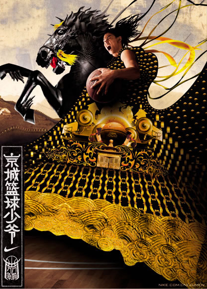 受啟于北京人獨有的“皇帝”情結(jié)及北京籃球中體現(xiàn)的中國文化,耐克九門爭霸聯(lián)賽因此誕生;@球文化和中國元素的顛覆結(jié)合,迸發(fā)出奇妙的視覺效果;充滿霸氣的“京城籃球少爺”頭銜更是將耐克籃球精神傳達(dá)得淋漓透徹。