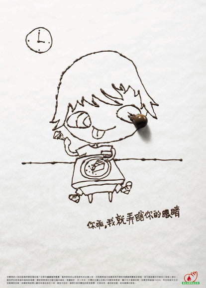 畫面呈現(xiàn)可愛而有食慾的甜食感,與標題做衝擊對比,提醒大人們,為了安撫小孩而給糖吃,可能會造成日後糖尿病的後果:瞎眼 / 截肢達彼思廣告股份有限公司公益及公民教育-系列創(chuàng)意總監(jiān): 游明仁 / 文雅慧 文案: 文雅慧 美術(shù)指導: 遊明仁 / 呂心菱 插圖/電腦繪圖: 呂心菱 平面攝影師: 張錦祥