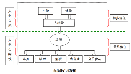 空掩、地推的核心要解決問題,就是:讓人們知道,并初步相信,我們是一個解決他們問題的方法,從而讓他們對產(chǎn)品感興趣。即是解決“不知道”的問題,初步解決“相信”的問題,從而讓人們有興趣來到終端來。終端靠陳列、演示、解說、利益點(diǎn)等解決“信任問題”。可以說,終端干的是射門的活,空掩、地推干的是傳球的活。