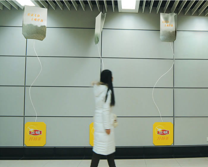 地鐵里,茶包綁在地鐵柱子上,讓柱子變細(xì)了;兩個廣告牌之間用茶包綁著,掀起了廣告紙,露出燈管,更收緊了廣告畫面上人的腰;飛揚起來的茶包,顯示一個輕盈的體態(tài)。作品提供:2007龍璽攏合大獎