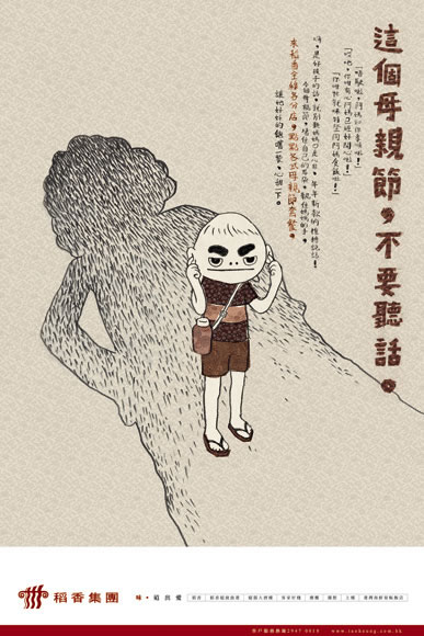 縱觀市面上的父親節(jié) / 母親節(jié)報章廣告,大多都偏向溫馨或感人的創(chuàng)意傳遞推廣信息。為了為顧客帶來耳目一新的感覺,同時令稻香品牌形像更為突出,我們透過漫畫表達方式,以較輕鬆及生活化的主題帶出父親節(jié)及母親節(jié)的推廣信息。這樣既可增加廣告的趣味性,也能令顧客感受到稻香與別不同的親切感。