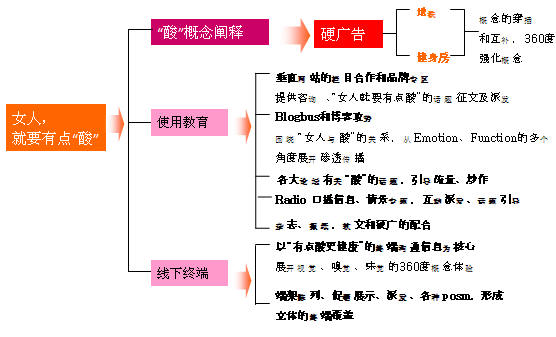 “酸”是我們要立的核心點(diǎn),而夏依品牌是目前市場(chǎng)盲點(diǎn),我們必須使其“酸”的概念強(qiáng)化。360度讓目標(biāo)人群接受到的夏依的點(diǎn)均與“酸”有關(guān),形成強(qiáng)有力的記憶點(diǎn),轉(zhuǎn)化成購(gòu)買理由。