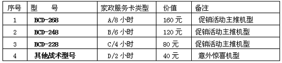 。1)在指定時(shí)間購(gòu)買M品牌至尊冰箱或其他戰(zhàn)術(shù)型號(hào),贈(zèng)送家政服務(wù)卡,具體方案如下: