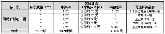 1、 促銷方案設(shè)計的活動內(nèi)容費用支出,如上面的摸獎活動費用為4.405元/箱