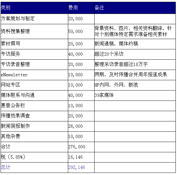 由于SARS的原因,我們在這次公關(guān)傳播中沒有可能舉辦任何形式的活動,這當(dāng)然有許多的遺憾,但也節(jié)省了費(fèi)用。主要費(fèi)用為公關(guān)咨詢公司的服務(wù)費(fèi)。