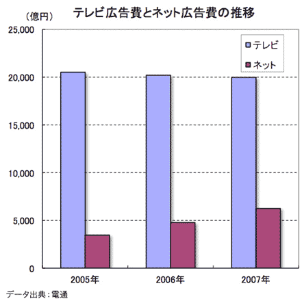 然而現(xiàn)在這種狀況也在悄然改變。老年人姑且不論,對(duì)于年輕的一代來說,內(nèi)容和形式的可供選擇方案目前已經(jīng)取得了絕對(duì)的優(yōu)勢(shì)。Youtube、Mix、2ch、Second life、Mobagetaun、Wii,近幾年正在逐漸成長(zhǎng)為電視的強(qiáng)勁對(duì)手。對(duì)年輕的一代來說電視廣告,只有為數(shù)眾多可供選擇方案之一而已。網(wǎng)絡(luò)廣告正在打破電視廣告對(duì)消費(fèi)者的寡頭壟斷割據(jù),而且正在逐漸動(dòng)搖著“電視廣告帝國(guó)大廈”的根基。