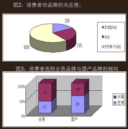 制冷家電的合資、國產(chǎn)品牌兩大陣營,在傳統(tǒng)家電領(lǐng)域歷經(jīng)洗禮也終成正果,合資品牌搶攤后發(fā)展勢頭良好;國產(chǎn)品牌通過這些年的拼殺,加之業(yè)內(nèi)的并購、合作,產(chǎn)業(yè)規(guī);布簩崿F(xiàn)。合資、國產(chǎn)在對峙中均充滿著挑戰(zhàn)與機遇,對于今夏市場的爆發(fā),市場的反應(yīng)也是積極的,但一直以來在中高端產(chǎn)品中有相當(dāng)優(yōu)勢的合資品牌似乎卻處于下風(fēng),調(diào)研數(shù)據(jù)來看:近階段購買制冷類家電消費者,60%并不關(guān)注度品牌,而關(guān)注品牌的表示選擇國產(chǎn)品牌的消費者遠高于合資品牌,冰箱則超過80%,空調(diào)也接近60%。似乎白電市場在夏天成了國產(chǎn)品牌的天下。