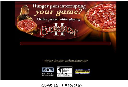 一方面,對(duì)某些類型的商品而言,通過和電子商務(wù)的結(jié)合,實(shí)現(xiàn)了產(chǎn)品展示在線、資金流在線、物流配送在線,特別是受眾從接受廣告到完成購買行為的整個(gè)在線過程,都可涵蓋在網(wǎng)絡(luò)游戲服務(wù)當(dāng)中。《大唐風(fēng)云》有一款能為玩家增加能量的食物:綠盛QQ能量棗,而玩家在游戲中的虛擬商店中,通過信用卡付款或者貨到付款的方式下單,就可以買到真實(shí)的綠盛QQ能量棗,并享受專門的配送服務(wù)。在索尼Everquest II游戲中,在不中斷游戲的情況下,鍵入“比薩”一詞,玩家便可進(jìn)入必勝客的網(wǎng)站,訂購比薩餅外賣。這種電子商務(wù)模型,只能是作為大的游戲背景下的一個(gè)支流,而很難出現(xiàn)電子商務(wù)為主,而游戲?yàn)檩o的模型。