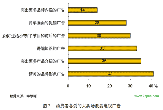 從研究結果來看,消費者對廣告的內容偏好的差別并不是非常明顯,相對而言,消費者更喜歡制作精美的品牌類廣告(圖2)。通常人們會認為大賣場液晶電視廣告近似于新形式的店頭廣告,應該更適合促銷,但從消費者的反應來看,他們對其中的促銷內容并不是很在意。