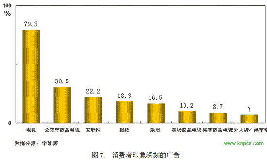 雖然大賣場液晶電視廣告擁有較高的到達率和較低的成本優(yōu)勢,但是與之相伴的是較低的廣告印象。我們的研究發(fā)現(xiàn),消費者對于大賣場液晶電視廣告產生深刻印象的比例不但次于電視和公交車液晶電視廣告,還次于互聯(lián)網、報紙、雜志等媒體(圖7)。前面的研究當中我們已經談到,消費者通常認為大賣場液晶電視廣告對她們起到了提醒作用(圖 1),但是大賣場液晶電視廣告本身使消費者產生了很深的品牌印象的比例并不高。同時我們前面的研究也顯示消費者對大賣場液晶電視廣告的品牌印象常常得益于同品牌的電視廣告效果。這一特點是需要引起廣告廠商和廣告公司注意的。