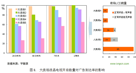 大賣場液晶電視廣告的另一個明顯的局限性是其效果受環(huán)境影響比較大,超市布局的混亂及周圍環(huán)境的嘈雜都會使大賣場液晶電視廣告的效果打折扣。另外,超市當中的液晶電視常常不是都能正常工作的,我們對幾個大賣場的研究表明,這點對大賣場液晶電視廣告的到達率也會產生直接影響(圖8)。